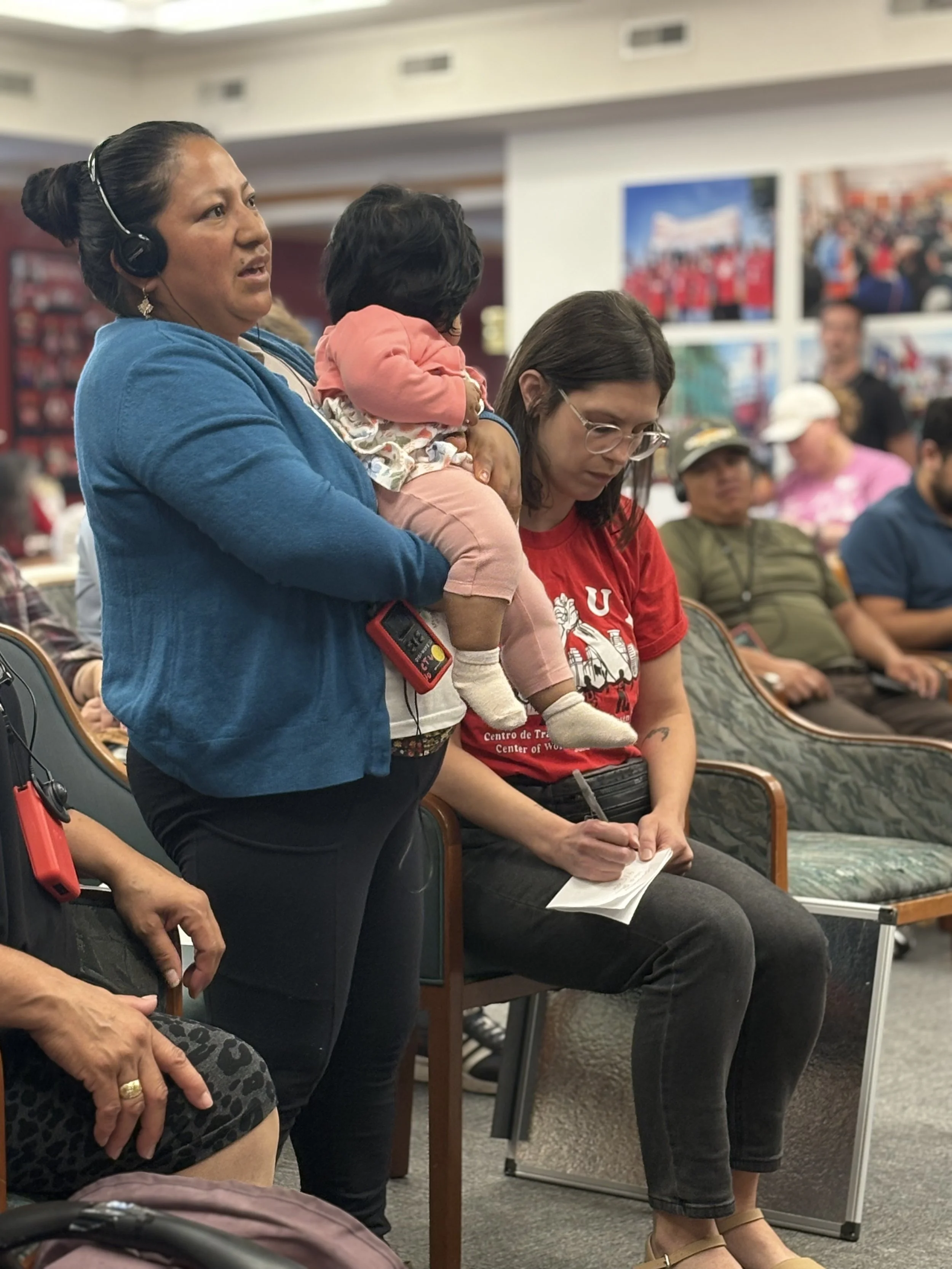 Pictured: Estella, a low-wage worker and member of CTUL Action Fund, is pictured here asking mayoral candidates about how they plan to protect and expand the co-enforcement budget.